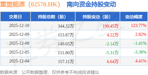 证券之星消息,12月10日南向资金增持190.45万股重塑能源(02570.HK)。近5个交易日中,获南向资金增持的有3天,累计净增持193.85万股。近20个交易日中,获南向资金增持的有8天,累计净增持271.94万股。截至目前,南向资金持有重塑能源(02570.HK)344.32万股,占公司已发行普通股的5.97%。