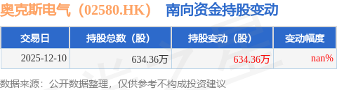 证券之星消息,12月10日南向资金增持634.36万股奥克斯电气(02580.HK)。截至目前,南向资金持有奥克斯电气(02580.HK)634.36万股,占公司已发行普通股的0.39%。