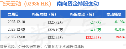 证券之星消息,12月10日南向资金减持2.47万股飞天云动(02986.HK)。截至目前,南向资金持有飞天云动(02986.HK)1325.72万股,占公司已发行普通股的10.18%。