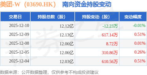 证券之星消息,12月10日南向资金减持12.23万股美团-W(03690.HK)。近5个交易日中,获南向资金增持的有4天,累计净增持1535.06万股。近20个交易日中,获南向资金增持的有15天,累计净增持3768.21万股。截至目前,南向资金持有美团-W(03690.HK)12.12亿股,占公司已发行普通股的19.83%。