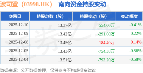 证券之星消息,12月10日南向资金减持554.0万股波司登(03998.HK)。近5个交易日中,获南向资金减持的有4天,累计净减持2208.78万股。近20个交易日中,获南向资金减持的有10天,累计净减持1015.13万股。截至目前,南向资金持有波司登(03998.HK)13.37亿股,占公司已发行普通股的11.44%。