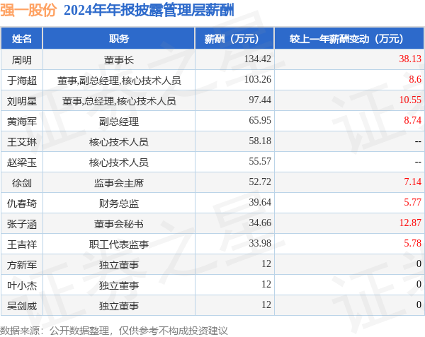 证券之星消息,强一股份发布2024年年报,数据显示:公司主营收入6.41亿元,同比增80.95%。归母净利润为2.33亿元,同比增1149.33%。扣非净利润为2.27亿元,同比增1477.52%。当年公司员工总数679人,同比增10.59%。人均薪酬20.97万元(注:"人均薪酬"根据定期报告中"应付职工薪酬"附注的本期增加值 / 员工总数计算而来),同比减3.22%。人均创收94.46万元,同比增63.63%。人均创利34.33万元,同比增1029.74%。其中管理层薪酬总额为711.82万元,同比上一年增14.07%,薪酬最高的为董事长周明,薪酬134.42万元。