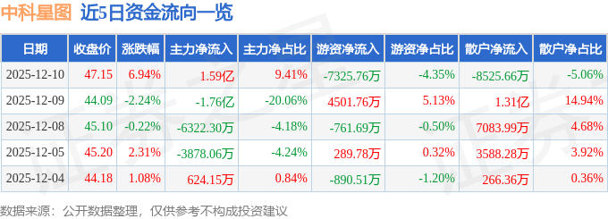 证券之星消息,截至2025年12月10日收盘,中科星图(688568)报收于47.15元,上涨6.94%,换手率4.45%,成交量35.99万手,成交额16.84亿元。