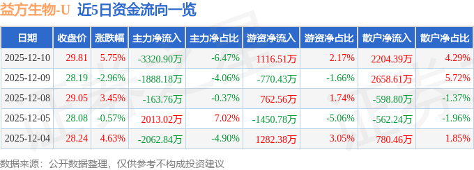 证券之星消息,截至2025年12月10日收盘,益方生物(688382)报收于29.81元,上涨5.75%,换手率4.19%,成交量17.51万手,成交额5.13亿元。