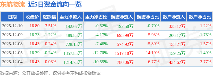 证券之星消息,截至2025年12月10日收盘,东航物流(601156)报收于16.8元,上涨3.51%,换手率1.75%,成交量16.5万手,成交额2.75亿元。