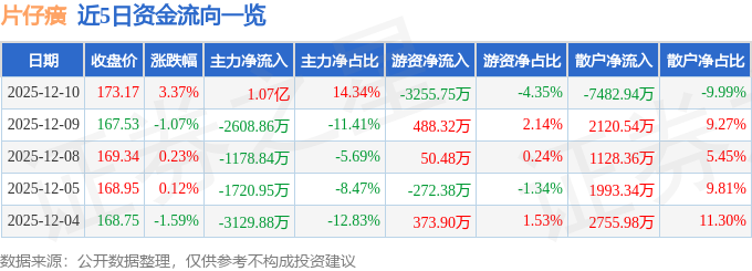 证券之星消息,截至2025年12月10日收盘,片仔癀(600436)报收于173.17元,上涨3.37%,换手率0.72%,成交量4.36万手,成交额7.49亿元。