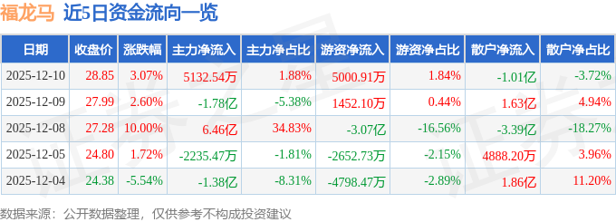 证券之星消息,截至2025年12月10日收盘,福龙马(603686)报收于28.85元,上涨3.07%,换手率23.19%,成交量96.35万手,成交额27.25亿元。