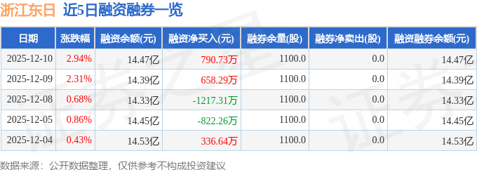 浙江东日融资融券信息显示,融资方面,当日融资买入6593.09万元,融资偿还5802.36万元,融资净买入790.73万元。融券方面,融券卖出0.0股,融券偿还0.0股,融券余量1100.0股,融券余额6.33万元。融资融券余额14.47亿元。
