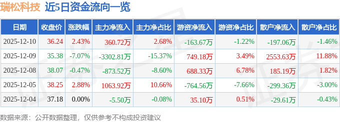 证券之星消息,截至2025年12月10日收盘,瑞松科技(688090)报收于36.24元,上涨2.43%,换手率3.09%,成交量3.78万手,成交额1.35亿元。