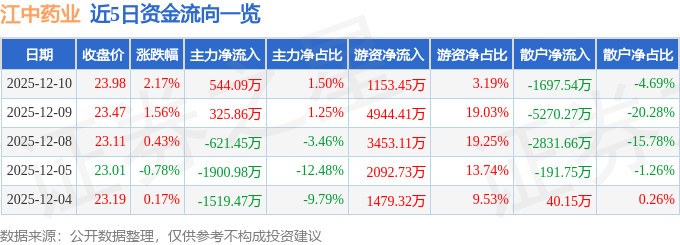 证券之星消息,截至2025年12月10日收盘,江中药业(600750)报收于23.98元,上涨2.17%,换手率2.41%,成交量15.13万手,成交额3.62亿元。