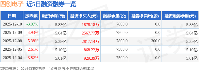 四创电子融资融券信息显示,融资方面,当日融资买入6081.44万元,融资偿还4203.26万元,融资净买入1878.18万元,连续3日净买入累计7263.09万元。融券方面,融券卖出0.0股,融券偿还0.0股,融券余量7800.0股,融券余额22.39万元。融资融券余额5.83亿元。