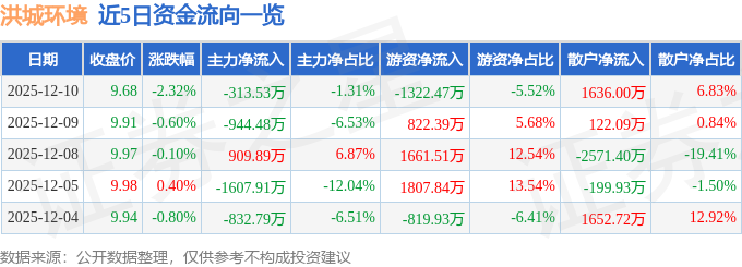 证券之星消息,截至2025年12月10日收盘,洪城环境(600461)报收于9.68元,下跌2.32%,换手率1.93%,成交量24.73万手,成交额2.4亿元。
