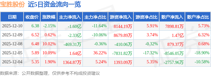 证券之星消息,截至2025年12月10日收盘,宝胜股份(600973)报收于6.38元,下跌2.15%,换手率15.9%,成交量218.07万手,成交额13.78亿元。