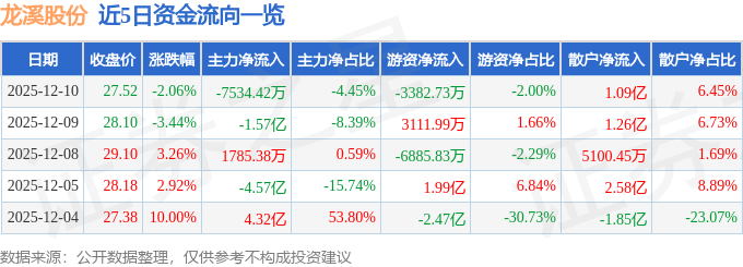证券之星消息,截至2025年12月10日收盘,龙溪股份(600592)报收于27.52元,下跌2.06%,换手率15.13%,成交量60.46万手,成交额16.91亿元。