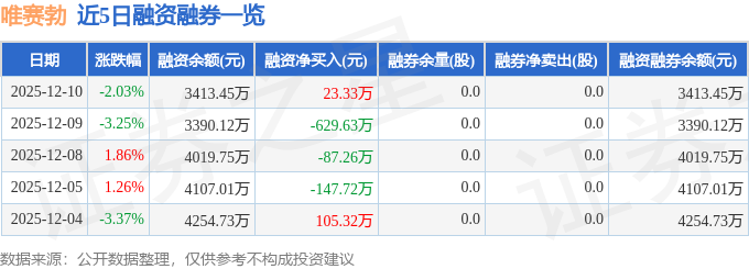 唯赛勃融资融券信息显示,融资方面,当日融资买入230.65万元,融资偿还207.32万元,融资净买入23.33万元。融券方面,融券卖出0.0股,融券偿还0.0股,融券余量0.0股,融券余额0.0万元。融资融券余额3413.45万元。