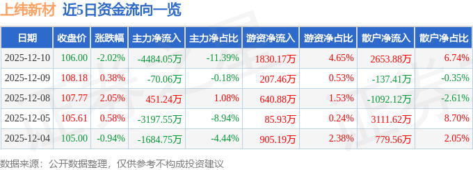 证券之星消息,截至2025年12月10日收盘,上纬新材(688585)报收于106.0元,下跌2.02%,换手率0.92%,成交量3.69万手,成交额3.94亿元。