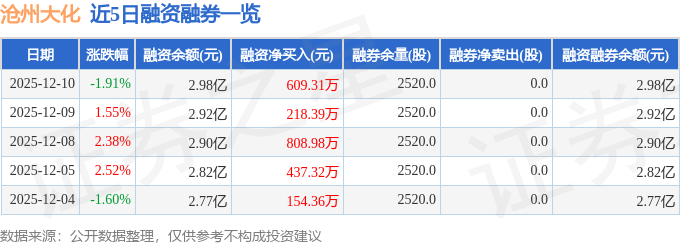 沧州大化融资融券信息显示,融资方面,当日融资买入1586.22万元,融资偿还976.9万元,融资净买入609.31万元,连续3日净买入累计1636.69万元。融券方面,融券卖出0.0股,融券偿还0.0股,融券余量2520.0股,融券余额3.24万元。融资融券余额2.98亿元。