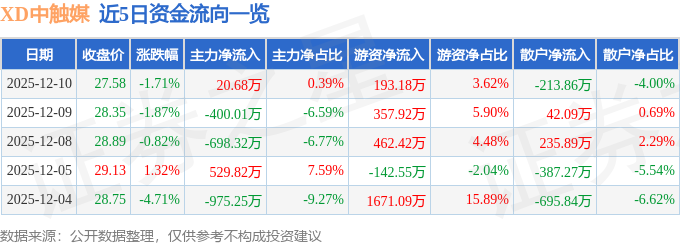 证券之星消息,截至2025年12月10日收盘,XD中触媒(688267)报收于27.58元,下跌1.71%,换手率1.09%,成交量1.93万手,成交额5342.66万元。
