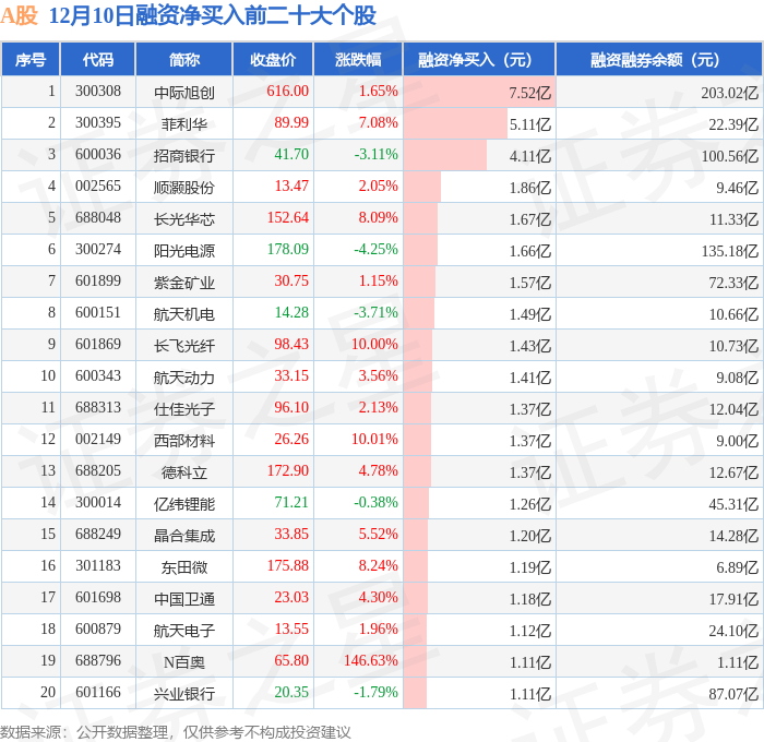 A股融资净买入前三分别为:中际旭创(300308)融资净买入7.52亿元、菲利华(300395)融资净买入5.11亿元、招商银行(600036)融资净买入4.11亿元,前20具体见下表: