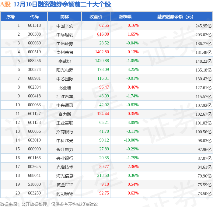 A股融资融券余额前三分别为:中国平安(601318)融资融券余额245.95亿元、中际旭创(300308)融资融券余额203.02亿元、中信证券(600030)融资融券余额186.77亿元,前20具体见下表: