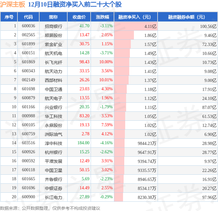 沪深主板融资净买入前三分别为:招商银行(600036)融资净买入4.11亿元、顺灏股份(002565)融资净买入1.86亿元、紫金矿业(601899)融资净买入1.57亿元,前20具体见下表: