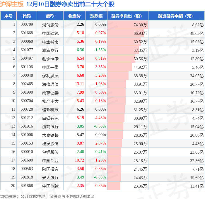 沪深主板融券净卖出前三分别为:河钢股份(000709)融券净卖出74.3万股、中国建筑(601668)融券净卖出66.93万股、中金岭南(000060)融券净卖出60.52万股,前20具体见下表: