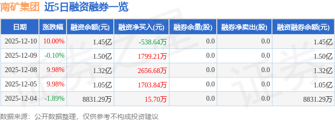 证券之星消息,截至2025年12月10日收盘,南矿集团(001360)报收于22.77元,上涨10.0%,涨停,换手率22.31%,成交量18.25万手,成交额4.0亿元。