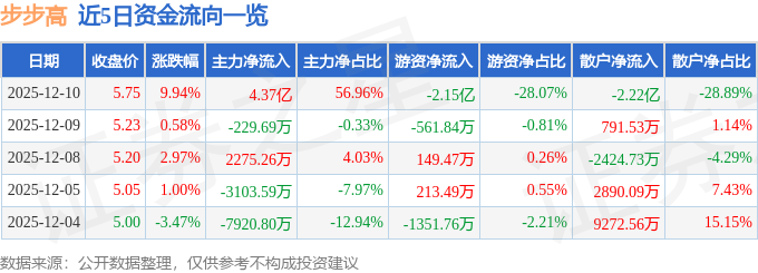 证券之星消息,截至2025年12月10日收盘,步步高(002251)报收于5.75元,上涨9.94%,涨停,换手率6.21%,成交量133.65万手,成交额7.68亿元。