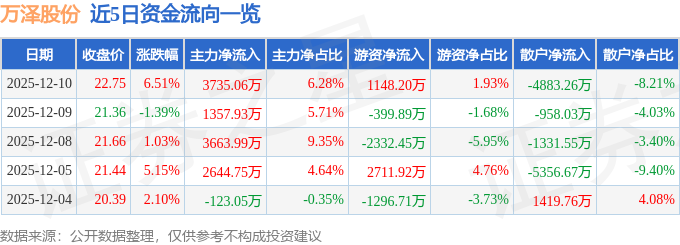 证券之星消息,截至2025年12月10日收盘,万泽股份(000534)报收于22.75元,上涨6.51%,换手率5.34%,成交量26.68万手,成交额5.95亿元。
