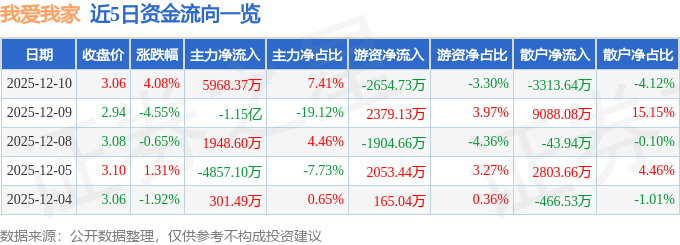 证券之星消息,截至2025年12月10日收盘,我爱我家(000560)报收于3.06元,上涨4.08%,换手率11.79%,成交量266.0万手,成交额8.05亿元。