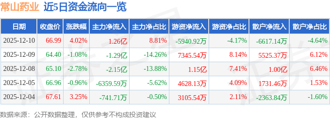 证券之星消息,截至2025年12月10日收盘,常山药业(300255)报收于66.99元,上涨4.02%,换手率2.37%,成交量21.72万手,成交额14.26亿元。