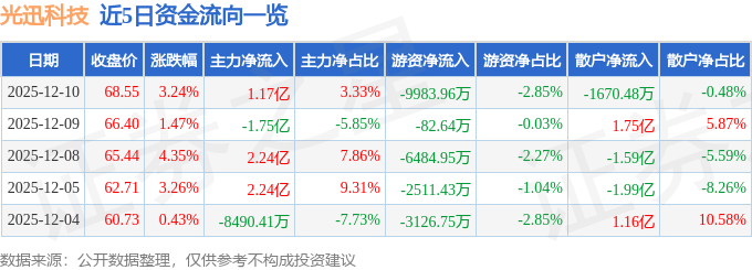 证券之星消息,截至2025年12月10日收盘,光迅科技(002281)报收于68.55元,上涨3.24%,换手率6.64%,成交量51.74万手,成交额34.98亿元。