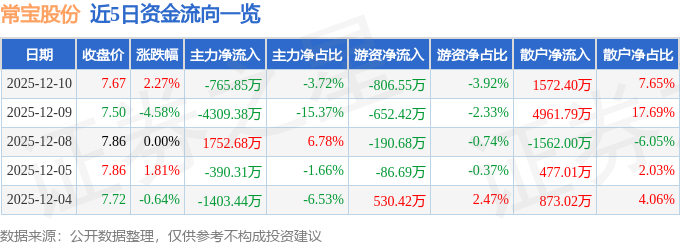 证券之星消息,截至2025年12月10日收盘,常宝股份(002478)报收于7.67元,上涨2.27%,换手率3.74%,成交量27.04万手,成交额2.06亿元。