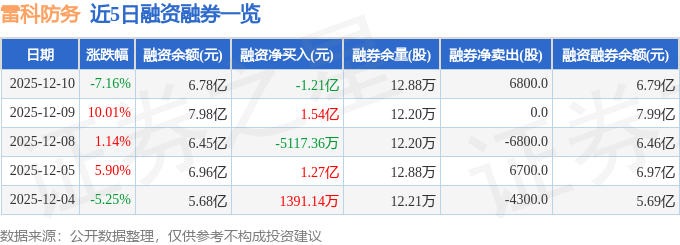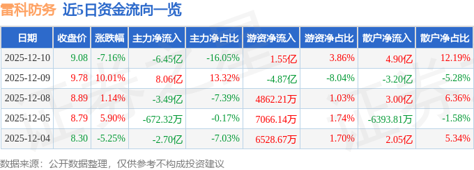 证券之星消息,截至2025年12月10日收盘,雷科防务(002413)报收于9.08元,下跌7.16%,换手率33.87%,成交量438.02万手,成交额40.19亿元。