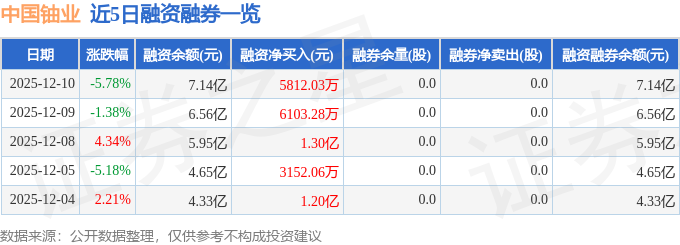 中国铀业融资融券信息显示,融资方面,当日融资买入3.28亿元,融资偿还2.7亿元,融资净买入5812.03万元,连续3日净买入累计2.49亿元。融券方面,融券卖出0.0股,融券偿还0.0股,融券余量0.0股,融券余额0.0万元。融资融券余额7.14亿元。