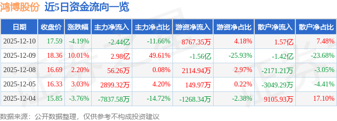 证券之星消息,截至2025年12月10日收盘,鸿博股份(002229)报收于17.59元,下跌4.19%,换手率23.64%,成交量116.59万手,成交额20.95亿元。