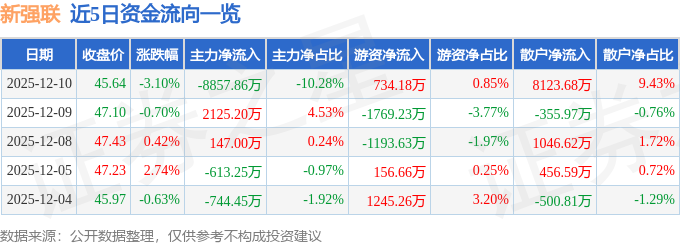 证券之星消息,截至2025年12月10日收盘,新强联(300850)报收于45.64元,下跌3.1%,换手率6.34%,成交量19.08万手,成交额8.62亿元。