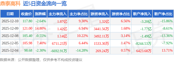证券之星消息,截至2025年12月10日收盘,鼎泰高科(301377)报收于117.8元,下跌2.64%,换手率24.92%,成交量17.7万手,成交额20.16亿元。