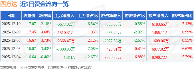 证券之星消息,截至2025年12月10日收盘,四方达(300179)报收于17.07元,下跌2.18%,换手率13.74%,成交量51.39万手,成交额8.68亿元。
