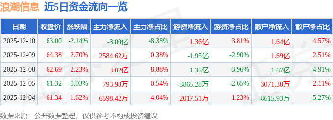 证券之星消息,截至2025年12月10日收盘,浪潮信息(000977)报收于63.0元,下跌2.14%,换手率3.91%,成交量57.35万手,成交额35.81亿元。