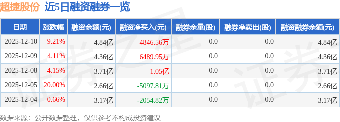 超捷股份融资融券信息显示,融资方面,当日融资买入2.93亿元,融资偿还2.45亿元,融资净买入4846.56万元,连续3日净买入累计2.18亿元。融券方面,融券卖出0.0股,融券偿还0.0股,融券余量0.0股,融券余额0.0万元。融资融券余额4.84亿元。