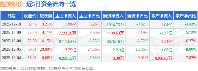 证券之星消息,截至2025年12月10日收盘,超捷股份(301005)报收于82.43元,上涨9.21%,换手率22.29%,成交量29.5万手,成交额23.36亿元。