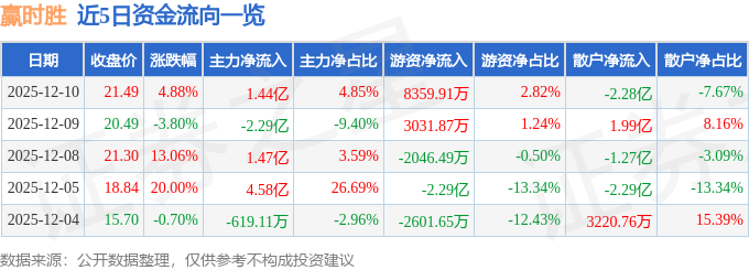 证券之星消息,截至2025年12月10日收盘,赢时胜(300377)报收于21.49元,上涨4.88%,换手率20.2%,成交量139.58万手,成交额29.66亿元。