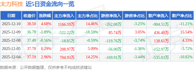 证券之星消息,截至2025年12月10日收盘,太力科技(301595)报收于38.5元,上涨4.68%,换手率8.66%,成交量2.11万手,成交额8066.27万元。