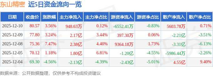 证券之星消息,截至2025年12月10日收盘,东山精密(002384)报收于80.57元,上涨3.56%,换手率7.05%,成交量97.74万手,成交额78.9亿元。