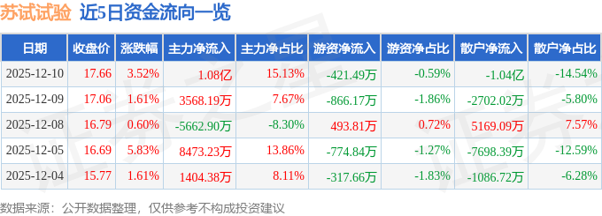 证券之星消息,截至2025年12月10日收盘,苏试试验(300416)报收于17.66元,上涨3.52%,换手率8.11%,成交量40.96万手,成交额7.13亿元。
