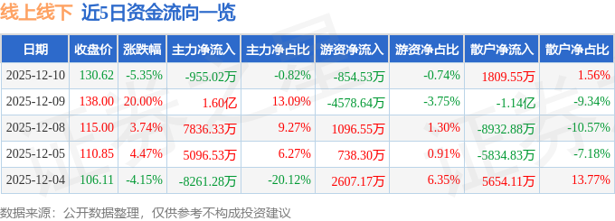 证券之星消息,截至2025年12月10日收盘,线上线下(300959)报收于130.62元,下跌5.35%,换手率16.81%,成交量8.8万手,成交额11.61亿元。