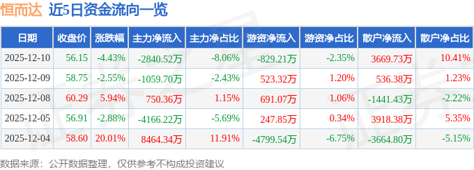 证券之星消息,截至2025年12月10日收盘,恒而达(300946)报收于56.15元,下跌4.43%,换手率8.21%,成交量6.23万手,成交额3.53亿元。