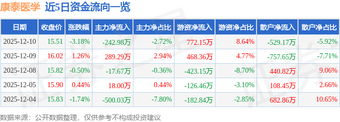 证券之星消息,截至2025年12月10日收盘,康泰医学(300869)报收于15.51元,下跌3.18%,换手率2.26%,成交量5.72万手,成交额8932.23万元。