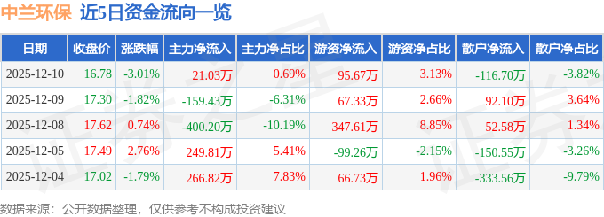证券之星消息,截至2025年12月10日收盘,中兰环保(300854)报收于16.78元,下跌3.01%,换手率2.21%,成交量1.8万手,成交额3053.46万元。